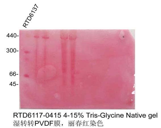 推薦使用RTD6137 非變性電泳蛋白質(zhì)Marker(45-880 kD),RTD6142 高分子量非變性電泳蛋白質(zhì)Marker II(45-669 kD)或者RTD6144 寬分子量非變性電泳蛋白質(zhì)Marker 21-880 kD。然而由于凝膠濃度較低,低于45 kD條帶會壓在前沿,可能不可見。