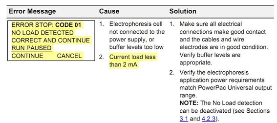 PAGE凝膠電泳期間,電流下降至低于1 mA很常見。有些電泳電源如伯樂電源有負(fù)載檢查功能,電流過低(低于4mA) 會認(rèn)為沒有負(fù)載,報(bào)錯(cuò)E1錯(cuò)誤代碼,終止電泳。解決方法是更換電泳電源,如使用國產(chǎn)電源;另外可以調(diào)高電壓高于300 V,使得電流不要低于4mA。