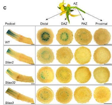 鑒于 SlGATA6 調(diào)控生長素運(yùn)輸載體 SlLAX2的表達(dá),該研究通過生長素特異性抗體的免疫熒光雜交技術(shù)及離區(qū)組織切片分析,在細(xì)胞層面揭示了生長素的空間分布模式,首次實(shí)現(xiàn)了生長素梯度的空間維度解析,證實(shí)了 SlGATA6 是維持這一梯度的關(guān)鍵。通過免疫熒光雙標(biāo)試驗(yàn)發(fā)現(xiàn),SlIAA3 與 SlIAA32 蛋白信號強(qiáng)度在遠(yuǎn)軸端到近軸端方向呈現(xiàn)相反的分布規(guī)律,即遠(yuǎn)軸端 SlIAA32 信號強(qiáng),SlIAA3 信號弱,近軸端則反之。值得注意的是,SlIAA32 和 SlIAA3 的總信號強(qiáng)度由遠(yuǎn)軸端到近軸端顯著減弱,形成了離區(qū)生長素的信號梯度。由于 SlIAA32 和 SlIAA3 均可以提高生長素信號,且破壞 SlIAA32 和 SlIAA3 的功能都能夠?qū)е律L素信號嚴(yán)重受損,表明 SlIAA32 和 SlIAA3 是建立生長素響應(yīng)梯度的關(guān)鍵因子。