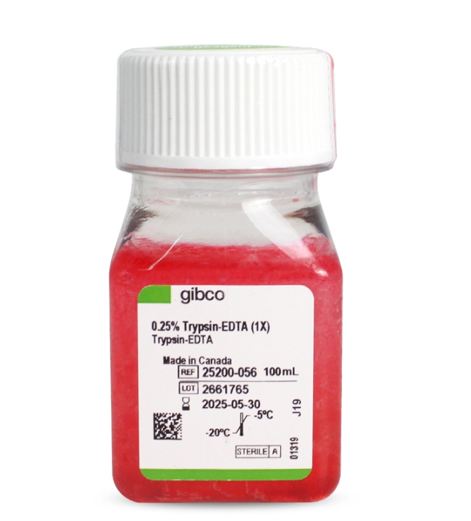 這種胰蛋白酶的液體配方含有EDTA和酚紅。Gibco胰蛋白酶EDTA是由胰蛋白酶粉制成的,胰蛋白酶粉是一種來自豬胰腺的蛋白酶的輻照混合物。由于其消化能力,胰蛋白酶被廣泛用于細(xì)胞分離、常規(guī)細(xì)胞培養(yǎng)傳代和原代組織分離。分離所需的胰蛋白酶濃度隨細(xì)胞類型和實(shí)驗(yàn)要求而變化。請參閱Gibco胰蛋白酶溶液的完整范圍和推薦的解離條件。