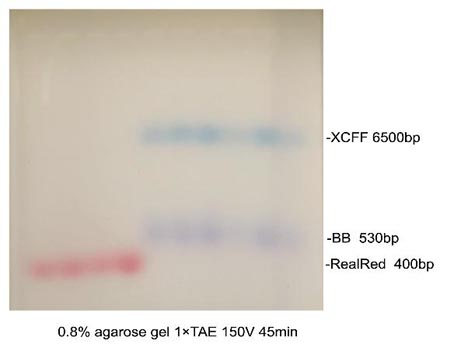 6×RealRed DNA上樣緩沖液(6×RealRed DNA loading buffer)是一種經(jīng)過(guò)改良的六倍濃縮的DNA上樣緩沖液。常規(guī)的以溴酚藍(lán)為指示劑的DNA緩沖液,由于溴酚藍(lán)的電泳的位置與200-500 bp的DNA的電泳位置相近,在EB染色觀(guān)察200-500bpDNA時(shí),溴酚藍(lán)對(duì)這些DNA片段的觀(guān)察有很強(qiáng)的干擾。特別是當(dāng)這些小片段的量較少時(shí),溴酚藍(lán)甚至?xí)研∑蜠NA的信號(hào)全部遮蓋掉。而該上樣緩沖液紅色指示前沿的電泳位置相當(dāng)于100-200 bp的DNA片段。這樣就可以基本消除染料對(duì)小片段DNA觀(guān)察時(shí)的干擾。另外,6×RealRed