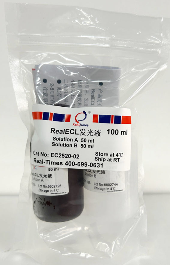 RealECL 是一種超敏ECL化學發(fā)光試劑盒,可與二抗上耦連的辣根過氧化物酶(HRP)發(fā)生化學反應,發(fā)出熒光,從而可以通過用X光片壓片或其它適當熒光成像設備檢測樣品。RealECL具有極高靈敏度和高信噪比,可檢測出10-100 fg的微量抗原;發(fā)光迅速,熒光可使X感光膠片感光達1小時以上,特別適用于痕量蛋白檢測;另外高靈敏度可以大大節(jié)省寶貴的樣品以及非常昂貴的一抗和二抗的用量,降低實驗成本。