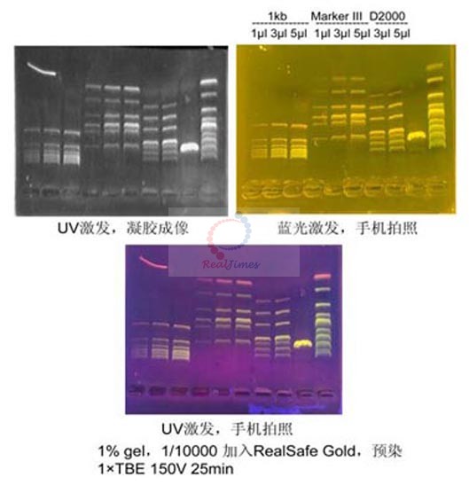 1.1 將RealSafe Gold試劑按1:10000溶于瓊脂糖凝膠溶液中,充分混勻。(例如:將5 μl RealSafe Gold 試劑加入到50 ml 凝膠溶液中)。注:由于RealSafe Gold 具有出色的熱穩(wěn)定性,可將試劑直接加入高溫的凝膠溶液中,而不用等凝膠溶液冷卻后再加入。