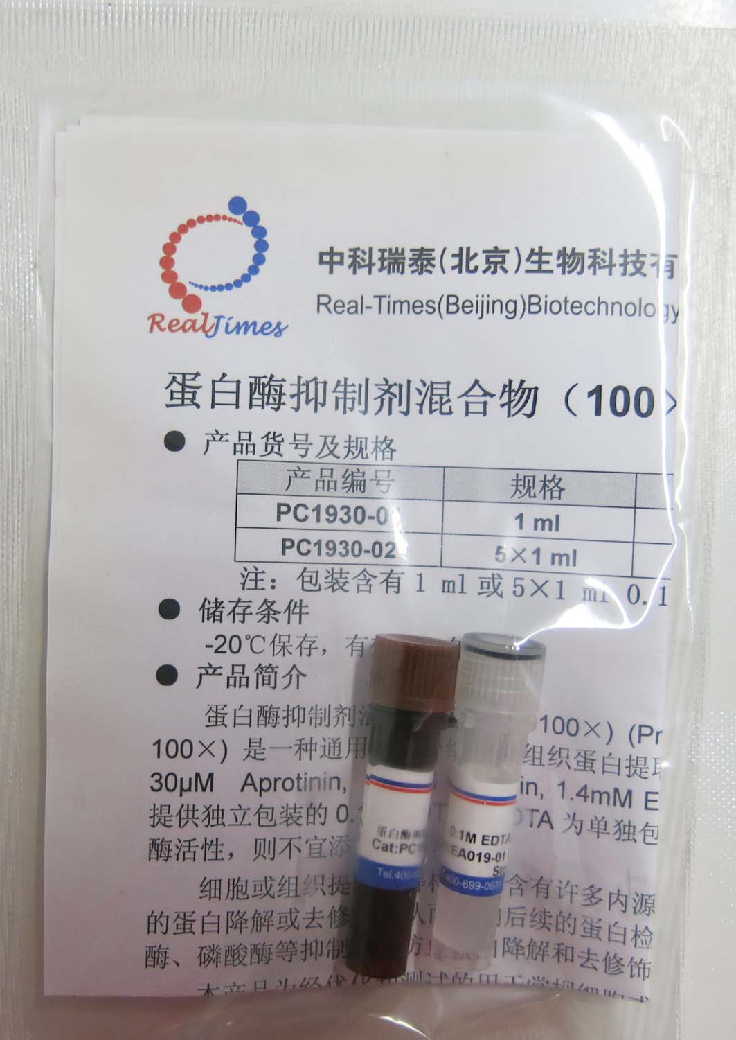 蛋白酶抑制劑混合物(通用型, 100×) (Protease inhibitor cocktail  for general use, 100×) 是一種通用型用于細(xì)胞或組織蛋白提取等的蛋白酶抑制劑混合物(200mMAEBSF,  30μM  Aprotinin, 1 mMBestatin,1.4mME64  and 1mMLeupeptin  in DMSO),并提供獨(dú)立包裝的0.1MEDTA。EDTA為單獨(dú)包裝,以便選擇性使用。如用于檢測(cè)金屬蛋白酶活性,則不宜添加EDTA。