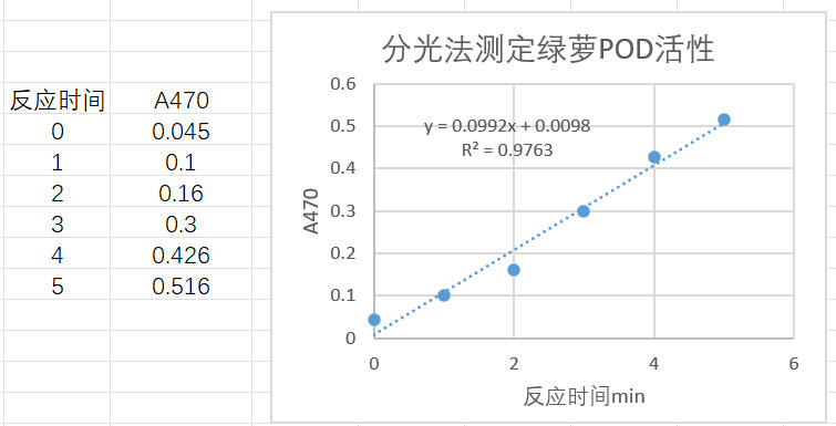 取0.5 克綠蘿葉片(FW=0.5),加入5 ml提取液(V總=5)冰浴勻漿,制成10%勻漿液,12000 rpm 4℃離心10 min,取上清置于冰上,取50 μl樣本(V樣=0.05)按照測定步驟操作,使用1 ml石英比色皿(光徑1 cm),設(shè)定分光光度計(jì)檢測波長470 nm,間隔1 min記錄數(shù)據(jù),采集5次;時(shí)間對吸光值做線性回歸曲線,3-4 min線性較好,1 min內(nèi)△A=0.426-0. 3=0.126。計(jì)算POD(U/g FW)=0.126/0.5×1/1×5/0.05×1= 25.2 U/g FW
