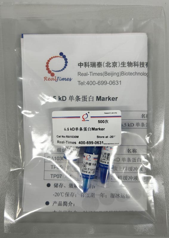 6.5 kD單條蛋白Marker 以干粉狀態(tài)提供。以每次使用配制好的溶液10 μl(0.2 μg/μl)計算,該產(chǎn)品可以大約使用500次。