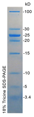 本產(chǎn)品包含5種多肽和3種低分子量蛋白質(zhì)組成,分子量范圍為3.4kD-100kD??梢杂脕?lái)判斷 SDS-PAGE上多肽和小蛋白的分子量。
