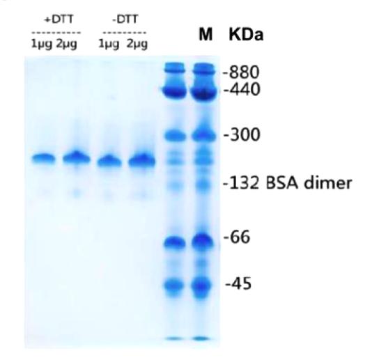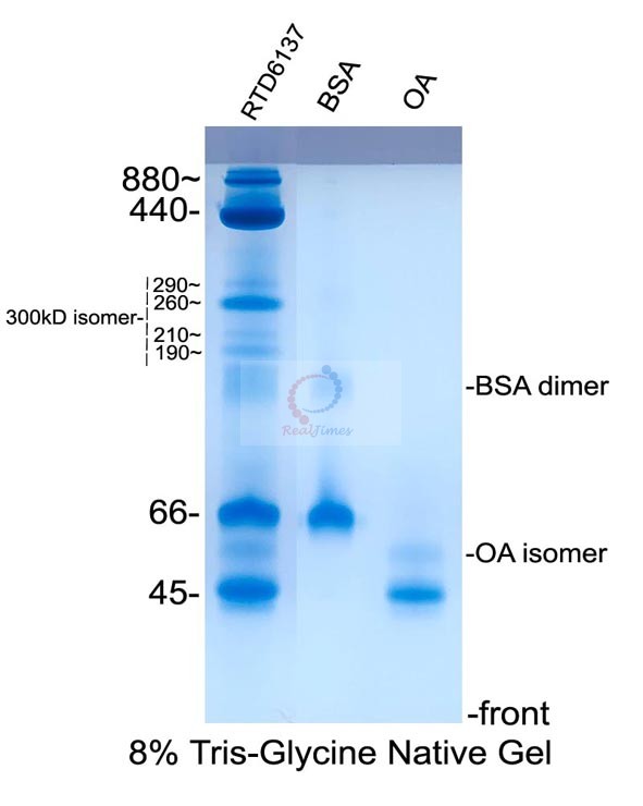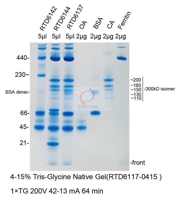 本產(chǎn)品有4種蛋白組成,分子量范圍為45-880 kD,經(jīng)過非變性電泳后,用考馬斯亮藍(lán)染色后可以得到5條主帶。