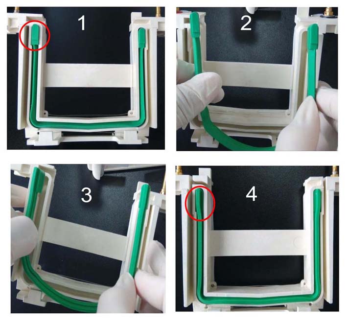 注:伯樂Mini III或Mini-PROTEAN Tetra Cell,天能VE-180,六一24K系列電泳槽請確保密封條的安裝方向(下圖)。