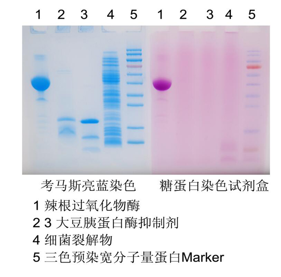 本產(chǎn)品用于PAGE 凝膠或蛋白免疫印記硝酸纖維素膜上糖蛋白的檢測。整個染色2.5小時完成。染色后的糖蛋白為品紅色條帶,背景為淺粉色或者無色。該試劑盒檢測的靈敏度一般可以達到微克級別,但實際靈敏度跟靶蛋白糖基化程度相關(guān),可以用于 SDS-PAGE 和2D電泳的凝膠檢測,也可以用于瓊脂糖凝膠電泳的檢測(但背景較高),還可以用于硝酸纖維素印跡膜的檢測。