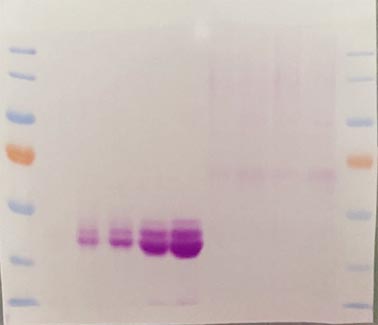 凝膠中加入25 ml糖蛋白染色試劑,搖床慢搖15 分鐘,糖蛋白會在5-10分鐘內(nèi)顯現(xiàn)品紅色。若檢測的糖蛋白含量較低,適當(dāng)延長顯色時間。棄染色溶液。