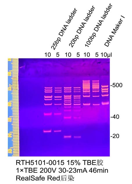 1.2 TBE- PAGE非變性電泳雙鏈DNA Marker可以選擇10 bp DNA ladder(10-100 bp)(貨號:RTM443)或20 bp DNA ladder(20-500 bp)(貨號:RTM441)或25 bp DNA ladder(25-500bp)(貨號:RTM444)作為分子量標準;單鏈DNA Marker可以選擇單鏈DNA Marker(20-75 nt)非預混型(貨號:RTM507)或單鏈DNA Marker(10-75 nt)非預混型(貨號:RTM509)。