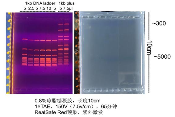 4. 推薦使用RealSafe系列染料(貨號:GR002,GR003,GR004)染色。如果使用Goldview或EB等染料進行染色,由于此類染料帶更多的正電荷(染料移動方向與核酸泳動方向相反),隨著電泳時間延長,染料向大片段聚集,凝膠會出現(xiàn)陰陽膠現(xiàn)象(染料含量高的凝膠紫外下較亮,含量低的凝膠紫外下發(fā)暗),導(dǎo)致小分子量DNA顯色很弱或不可見。陰陽膠可以在電泳結(jié)束后浸泡染色,將膠浸沒在含1 μg /ml EB或Goldview的電泳緩沖液中20-25 min,小分子量DNA會顯色清楚。更長時間浸泡會因DNA分子擴散而使條帶彌散,小分子量DNA更易彌散。
