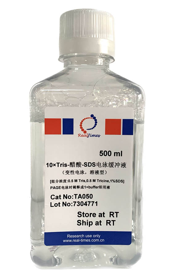 10×Tris-醋酸-SDS電泳緩沖液是可以用于Tris-醋酸系統(tǒng)蛋白凝膠電泳的電泳緩沖液,用于蛋白變性電泳。本溶液為10×濃縮液,使用前稀釋成1×即用型緩沖液使用。1×即用型Tris-醋酸-SDS電泳緩沖液組份濃度為:50 mM Tris,50